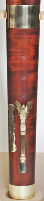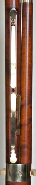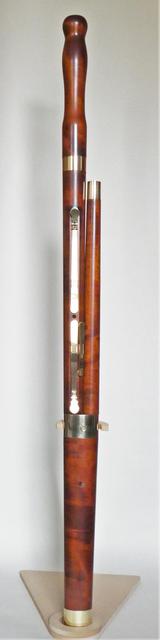 A reconstruction of the only bassoon surviving from this famous London woodwind maker. The single example, in the Waterhouse collection, is the earliest known English bassoon – it’s design is apparently derived from the early French models, of which none survive, and provided the model for all the English makers of the 18th Century. The original is a handsome beast in good cosmetic condition, but some of the internal structure has been damaged during its busy life. I have reconstructed the acoustic design with the help of data from the one surviving bassoon by Stanesby Junior (Thomas’s son and apprentice), and two by Caleb Gedney, Stanesby Jnr’s apprentice. (These later instruments were made to a very similar design, though adapted to play at higher pitches).